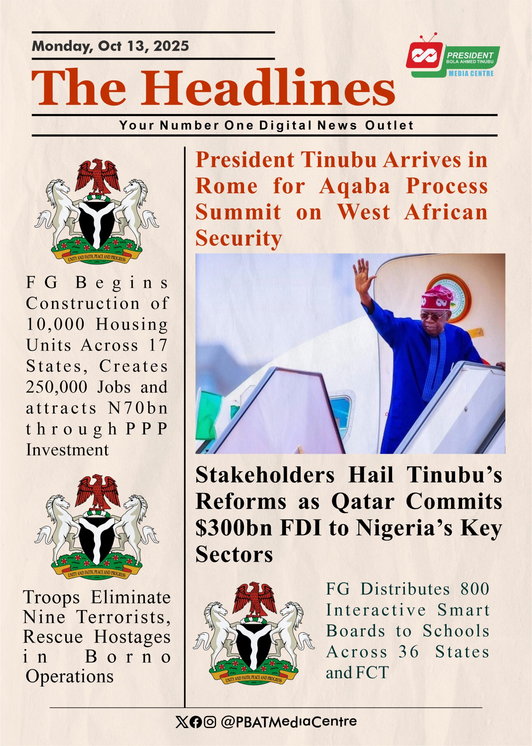– President Tinubu Arrives in Rome for Aqaba Process Summit on West African Security.